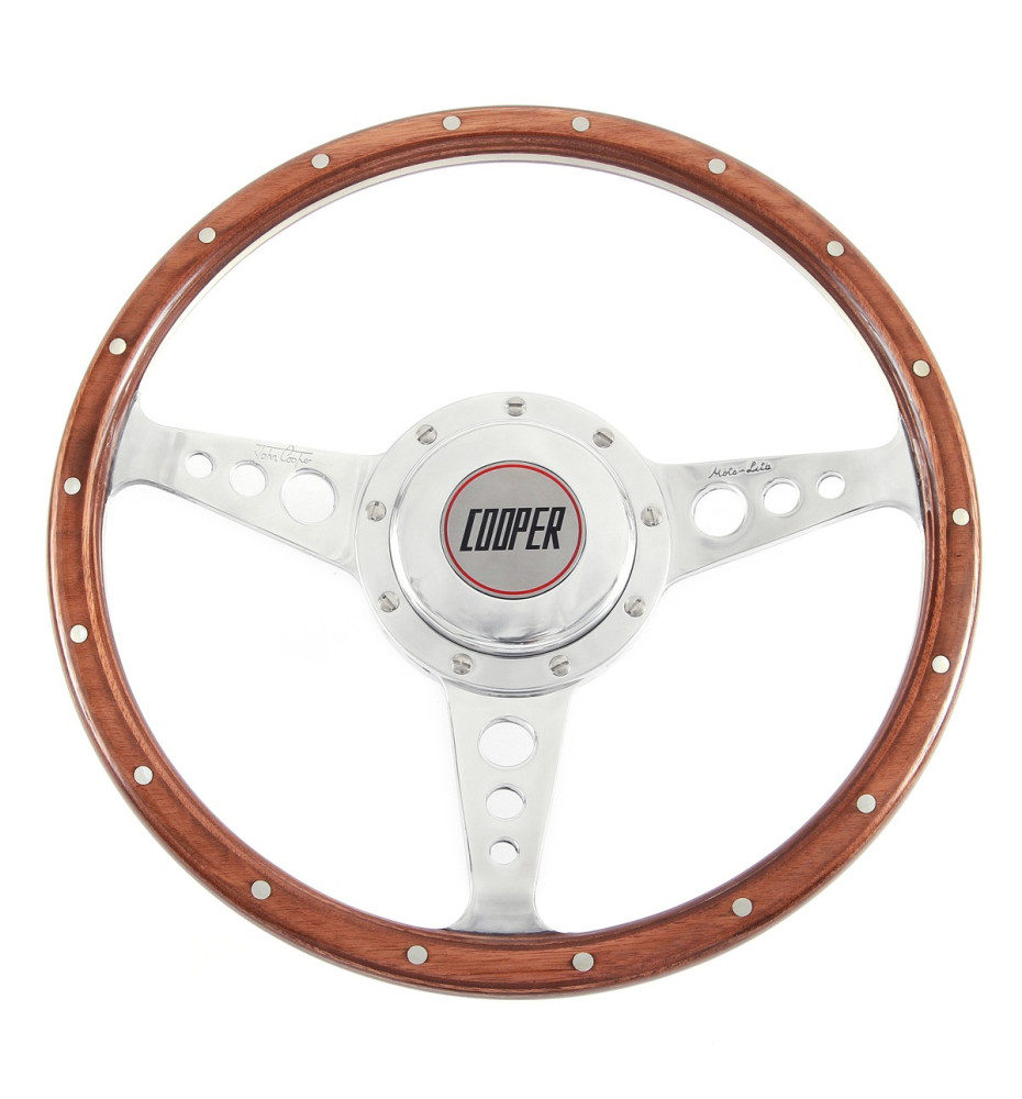 Completo di mozzo in acciaio spazzolato e centro volante con logo Cooper inciso e smaltato.